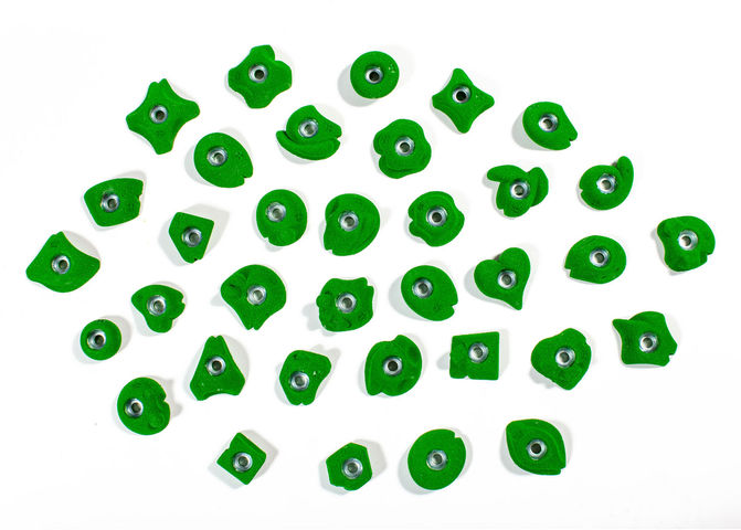 This set contains 35 different footholds.. The footholds in this set are suitable for setting medium - hard routes on overhangs as well as medium to hard routes on slabs. The beginners can use them for perfecting their footwork. Each climbing hold has a special opening on the side which is meant fort he extra screw to prevent the hold from spinning. When you rotate to hold you also change the positivity. The design of the holds reduces their strength. This holds should be affixed with the hand not with the machine. If you use the machine the holds can break.